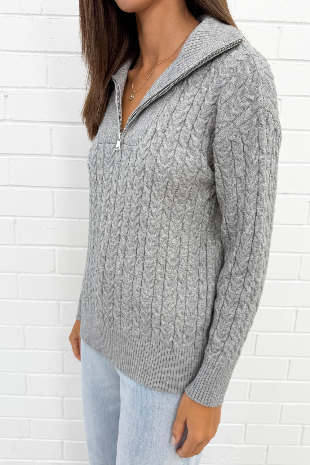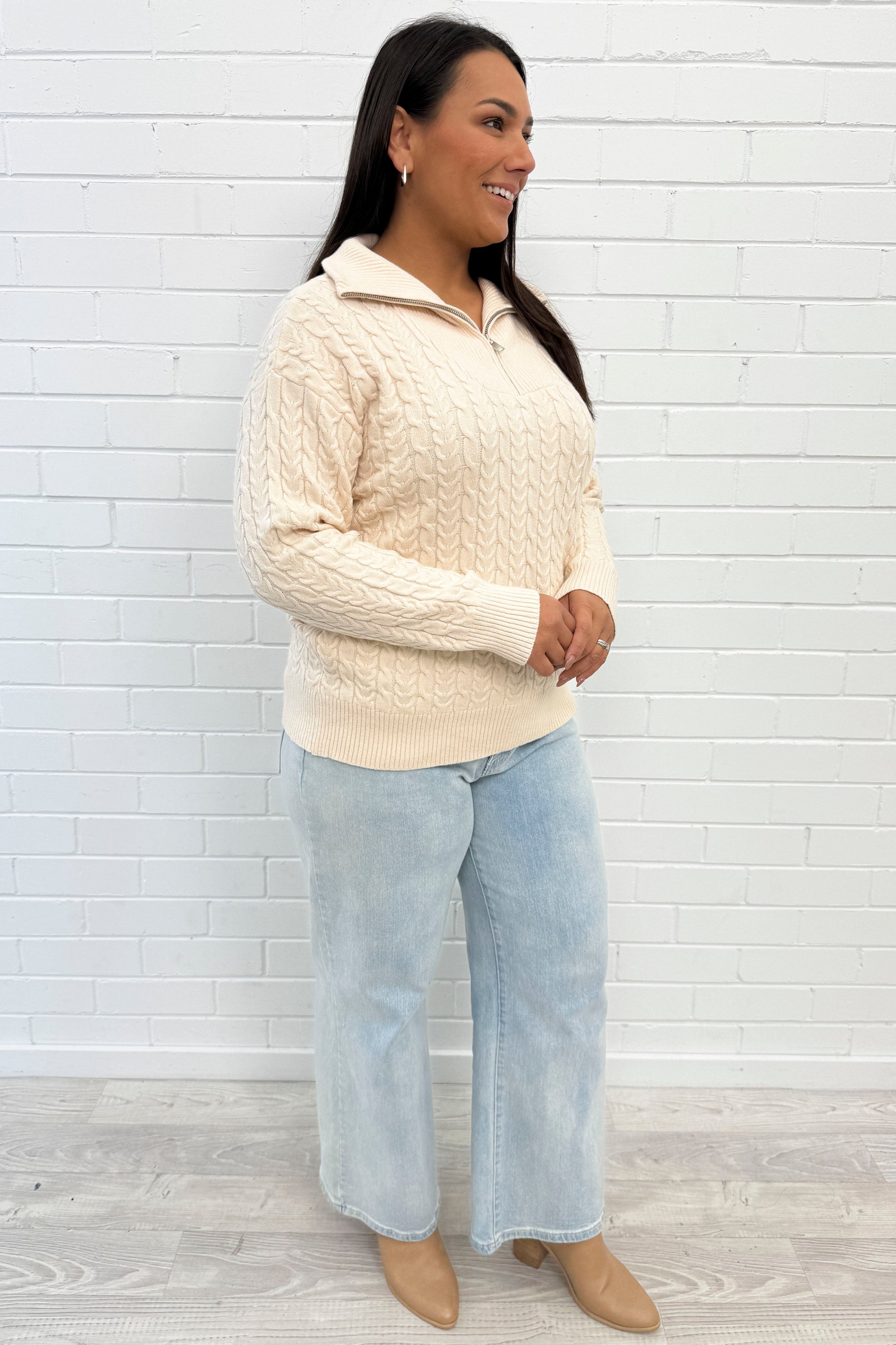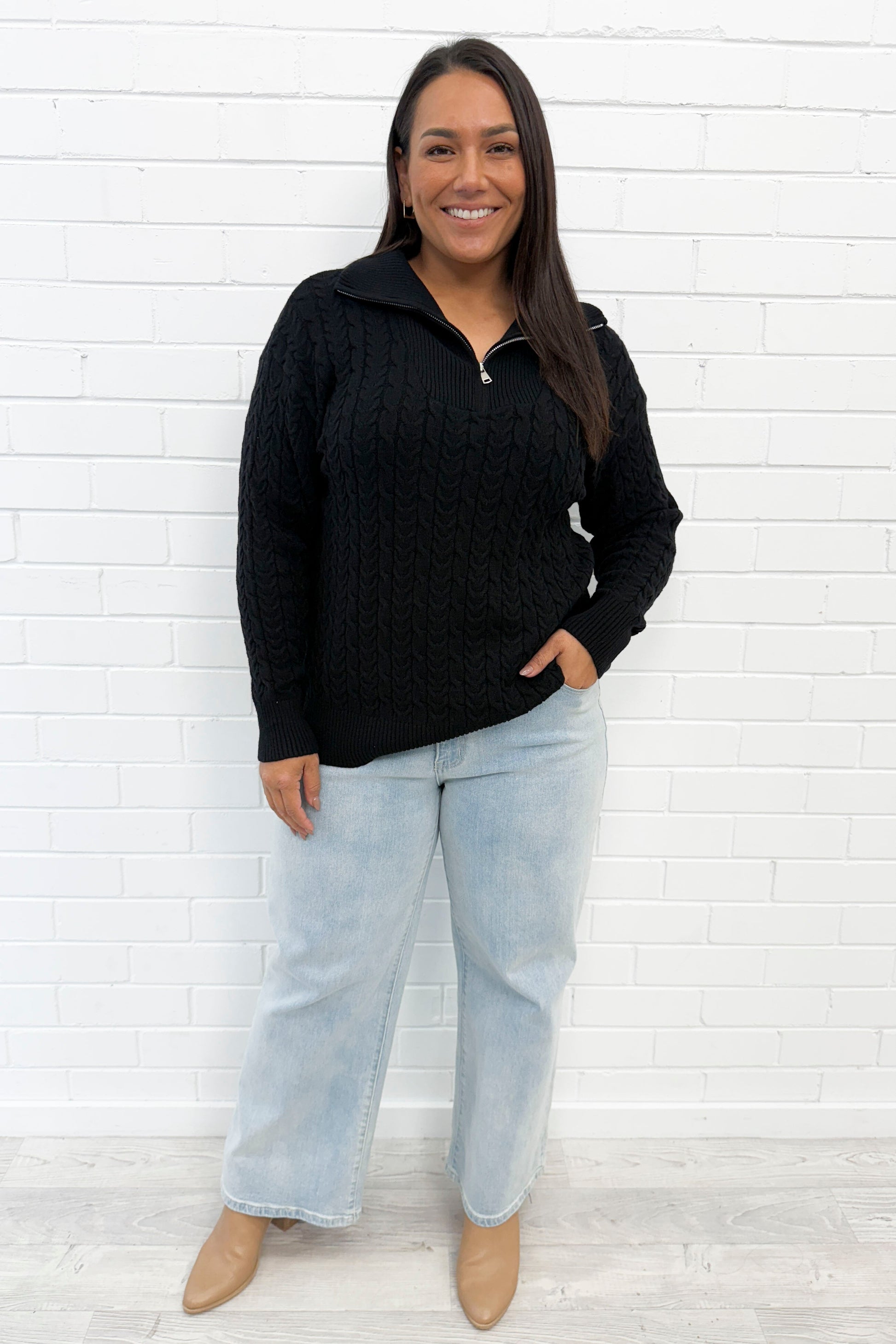 A lovely soft basic knit with lovely cable knit looking detail all over it. A functional zipper at the neckline, it’s really nice on. A little bit stretchy too.