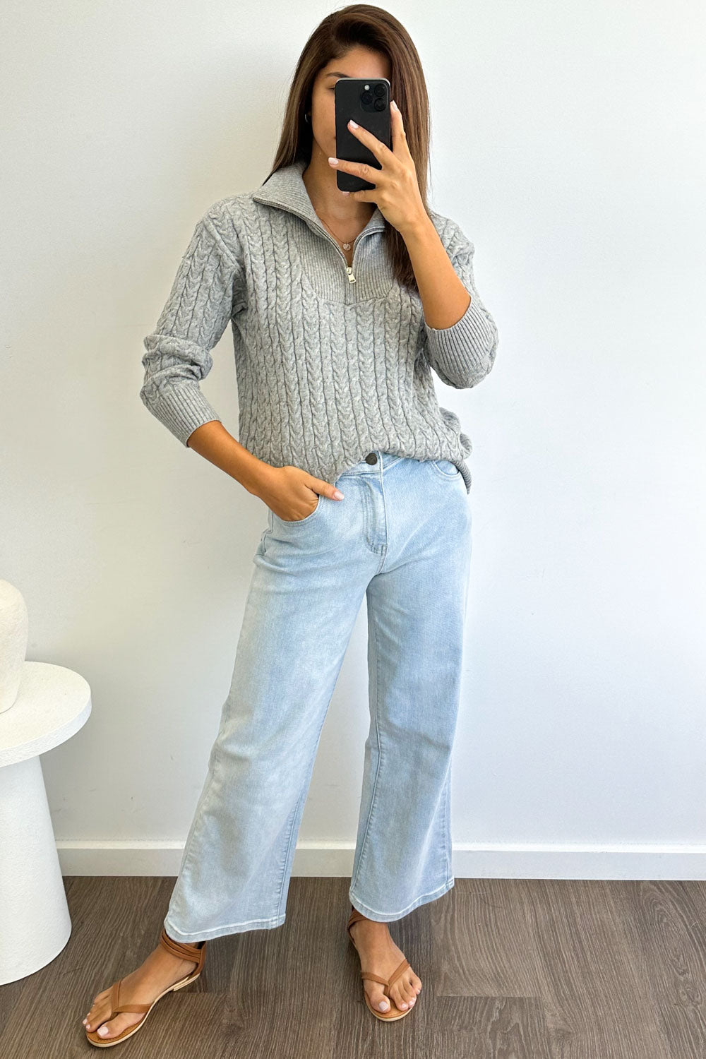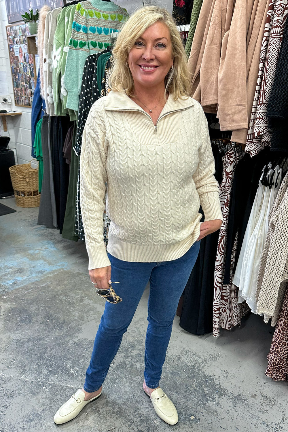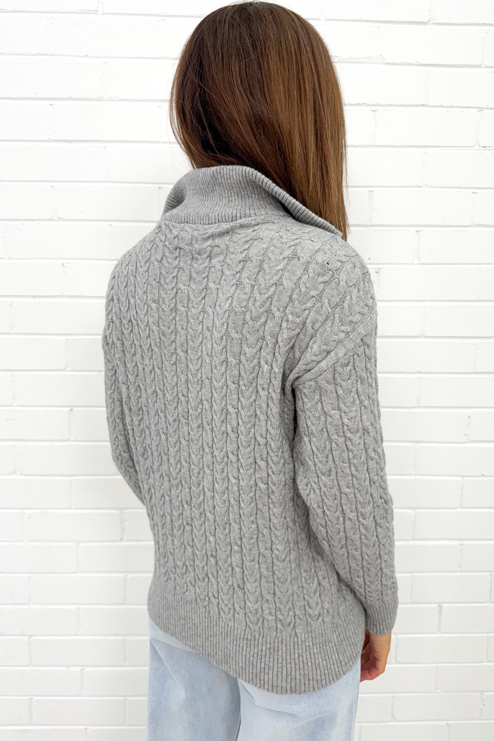 A lovely soft basic knit with lovely cable knit looking detail all over it. A functional zipper at the neckline, it’s really nice on. A little bit stretchy too.