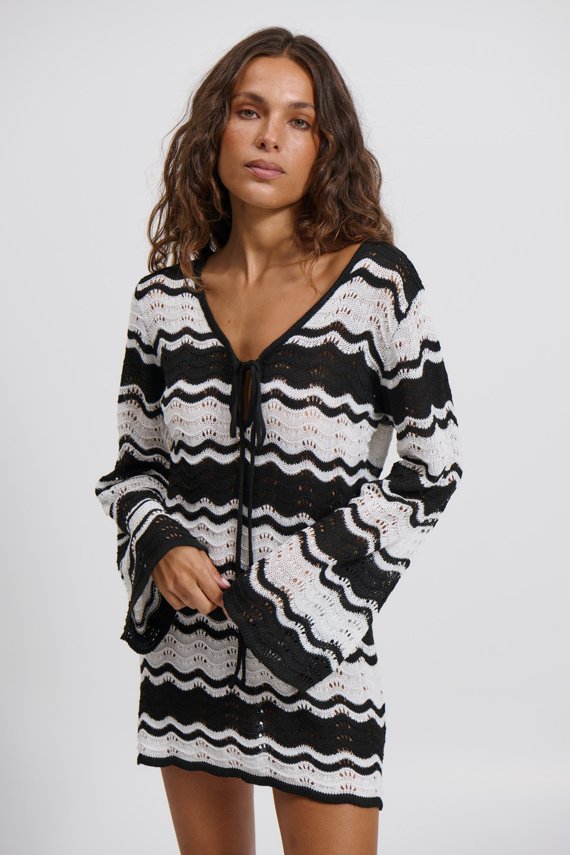 Meet the Aria Mini Dress, featuring a delicate V-neckline with a tie-up front closure. Designed with slightly flared sleeves and crochet material for a boho-chic touch, this unlined piece is perfect for layering or wearing as a breezy statement look.