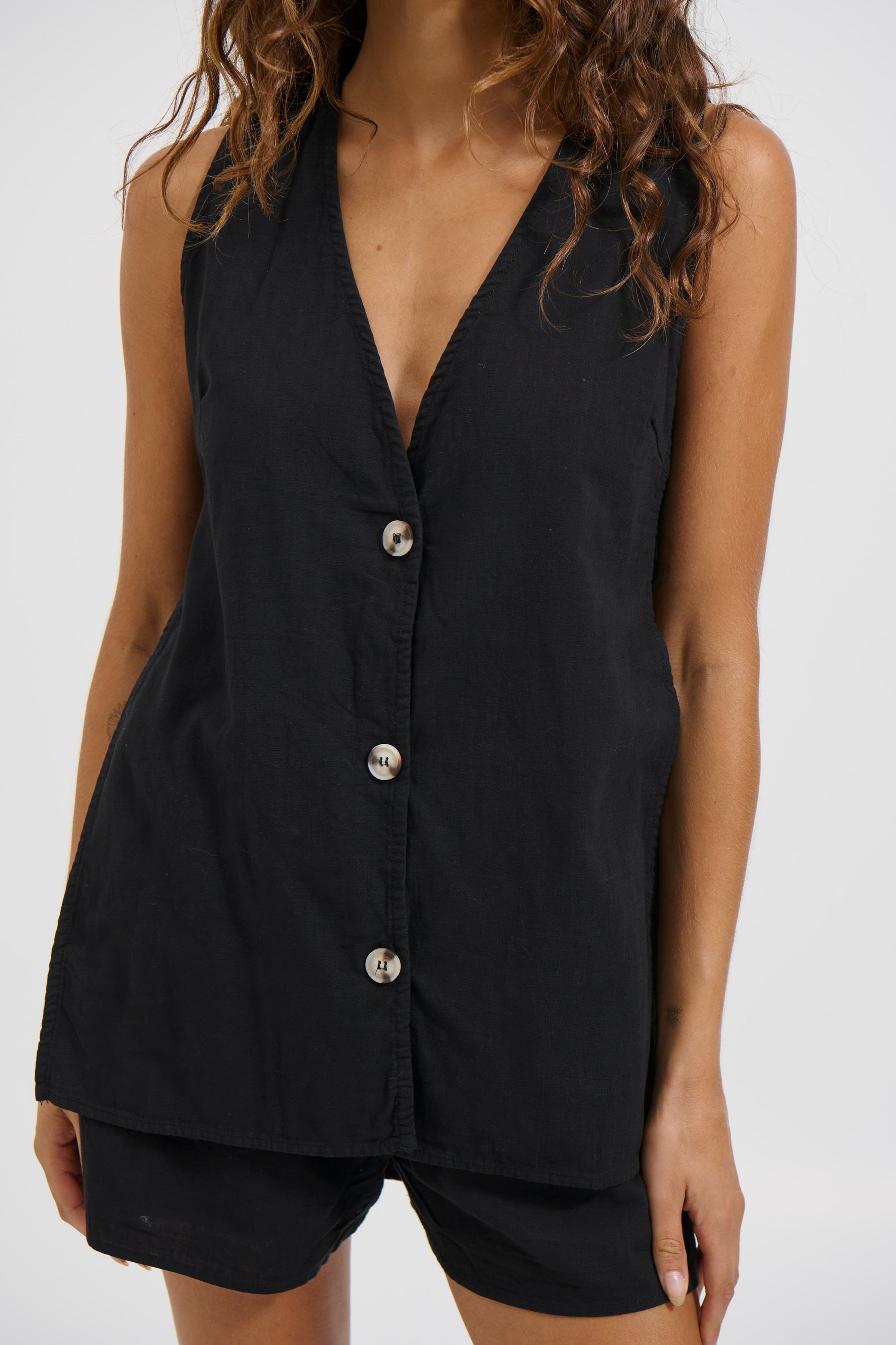 Introducing our Bonnie Set, Crafted from 100% breathable cotton, this set combines style and comfort. The vest features a button-front design and open sides with secure button closures. The shorts offer an elastic waistband, functional side pockets, and added convenience with extra pockets for essentials. Both pieces are fully lined for enhanced comfort.