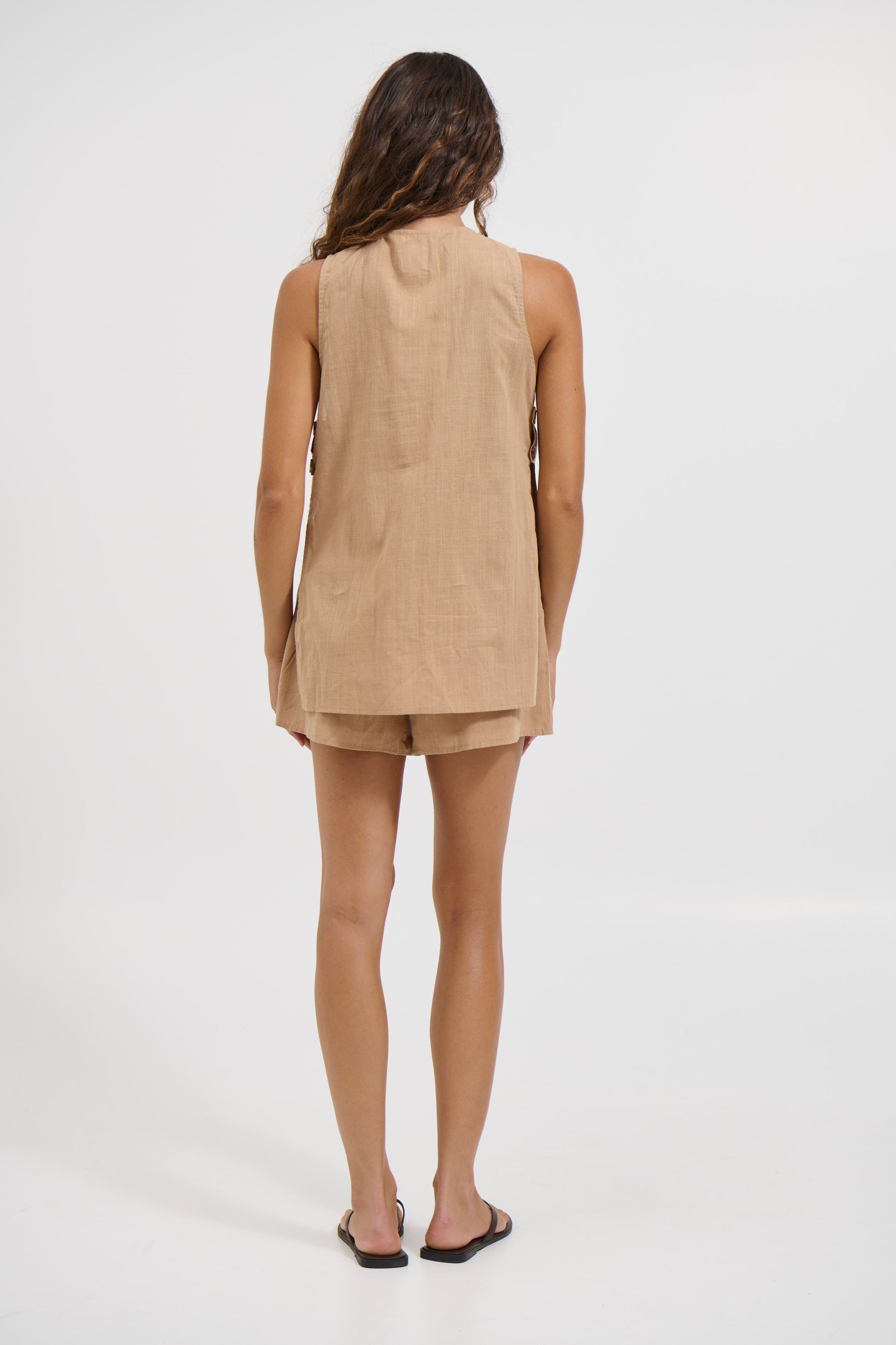 Introducing our Bonnie Set, Crafted from 100% breathable cotton, this set combines style and comfort. The vest features a button-front design and open sides with secure button closures. The shorts offer an elastic waistband, functional side pockets, and added convenience with extra pockets for essentials. Both pieces are fully lined for enhanced comfort.