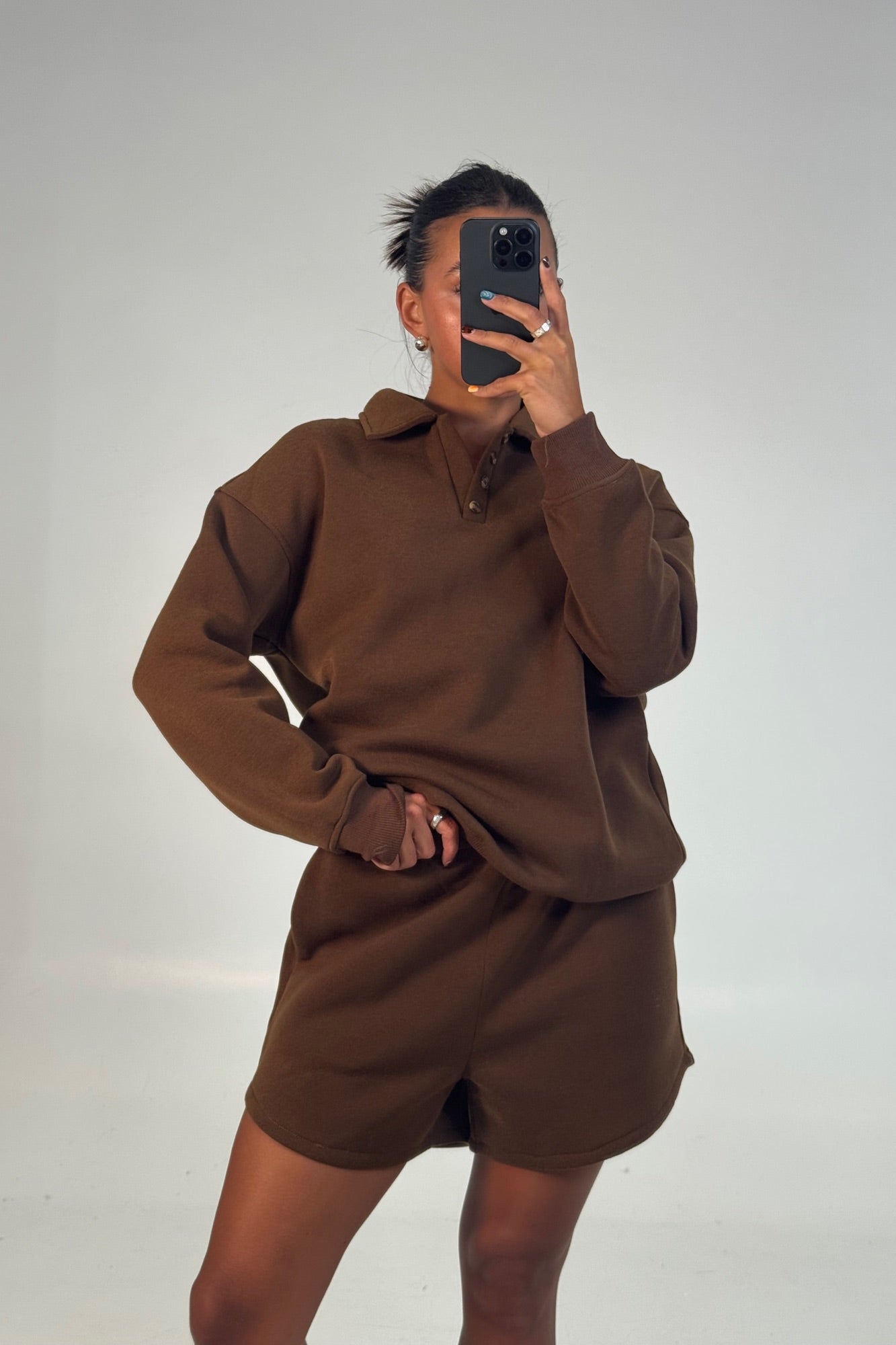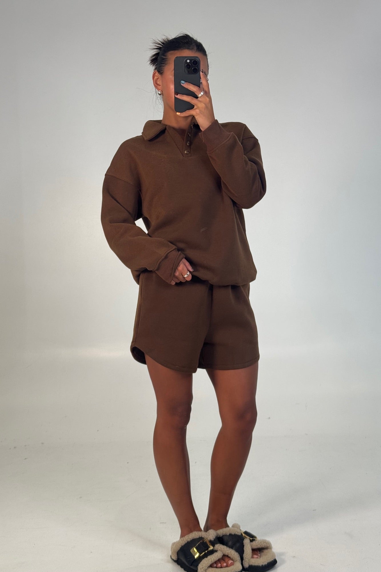Meet the Katie Set, This cozy set features a soft fleece rugby top with a classic collar and button-up neckline for a sporty touch. Paired with matching relaxed-fit shorts, designed with an elasticated waistband for all day comfort.