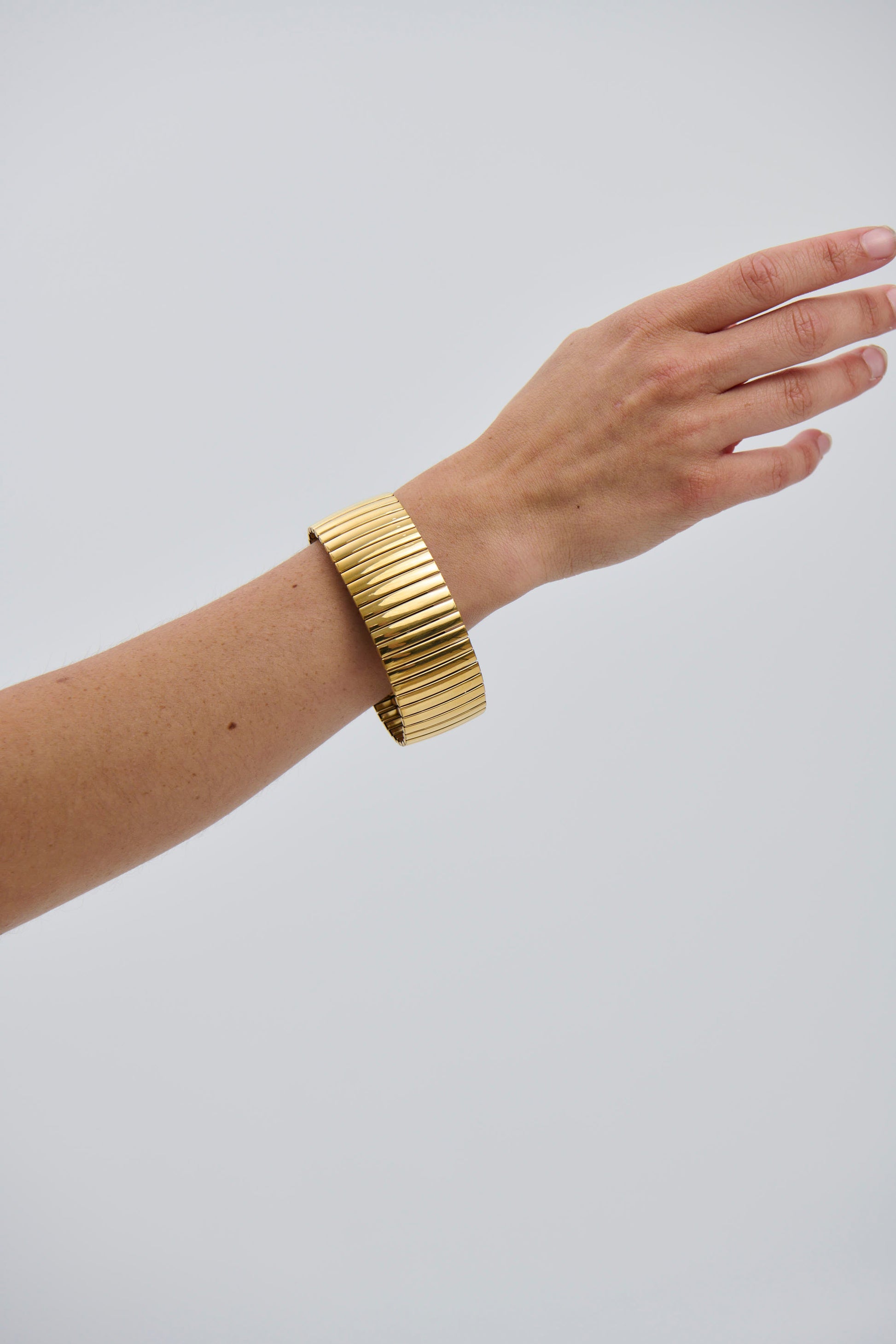 Meet Katrina Bracelet, This thick 18k Gold-plated bracelet featuring a flexible, ribbed design for a bold yet comfortable fit. Modern and striking, perfect for making a statement.
