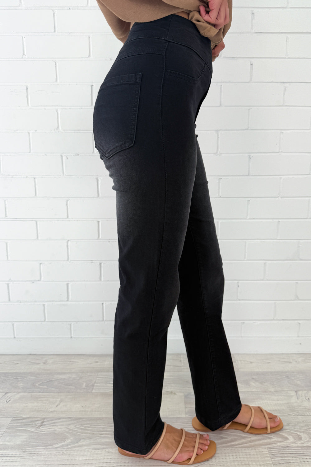 The tummy suckerinerer on these are the bomb diggity, they make you feel good. Super, super stretchy, they feel so gosh darn amazing on, almost like trackies. A wide leg version of our epic Panel Jeans, but without the panels. You'll feel really good in them.