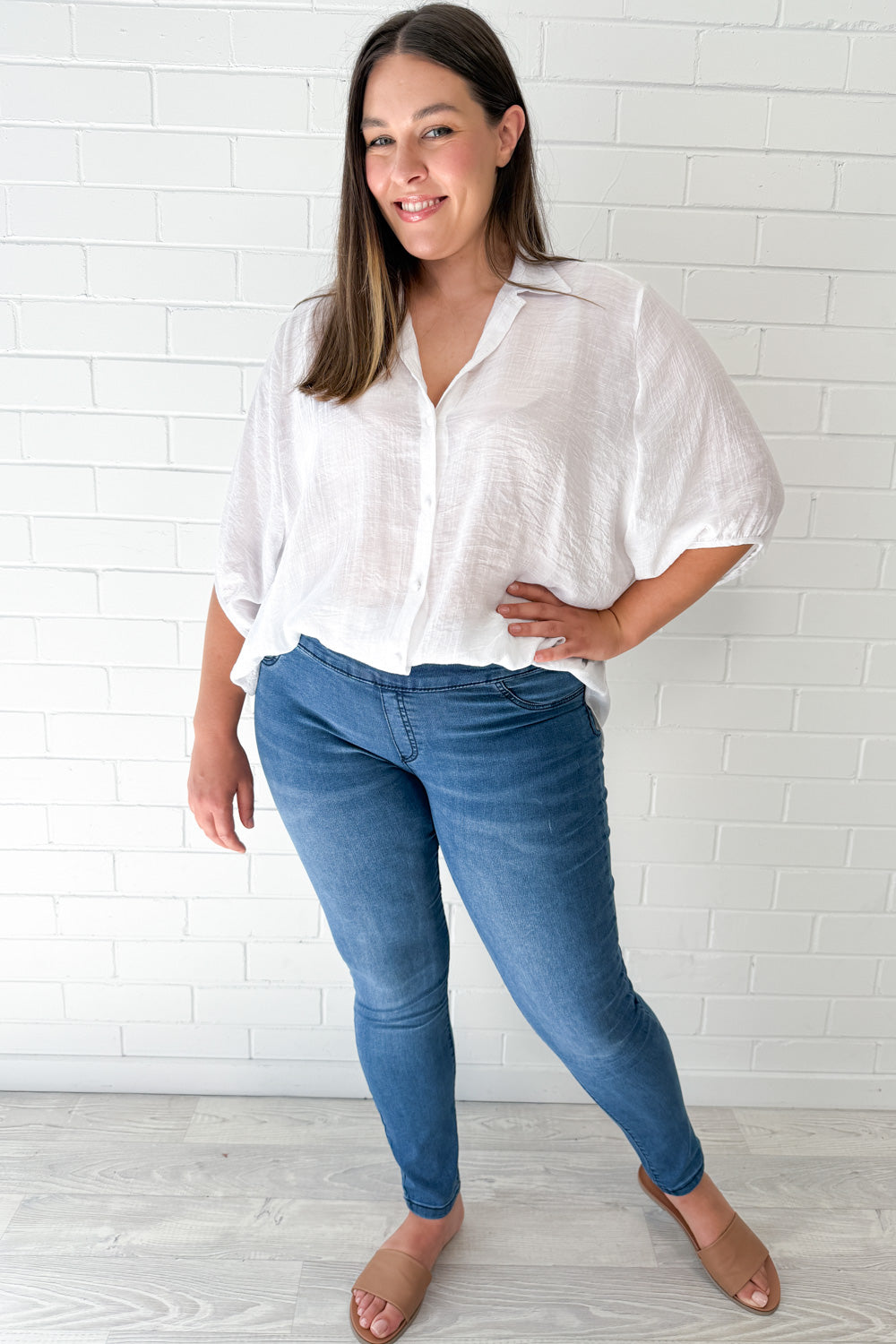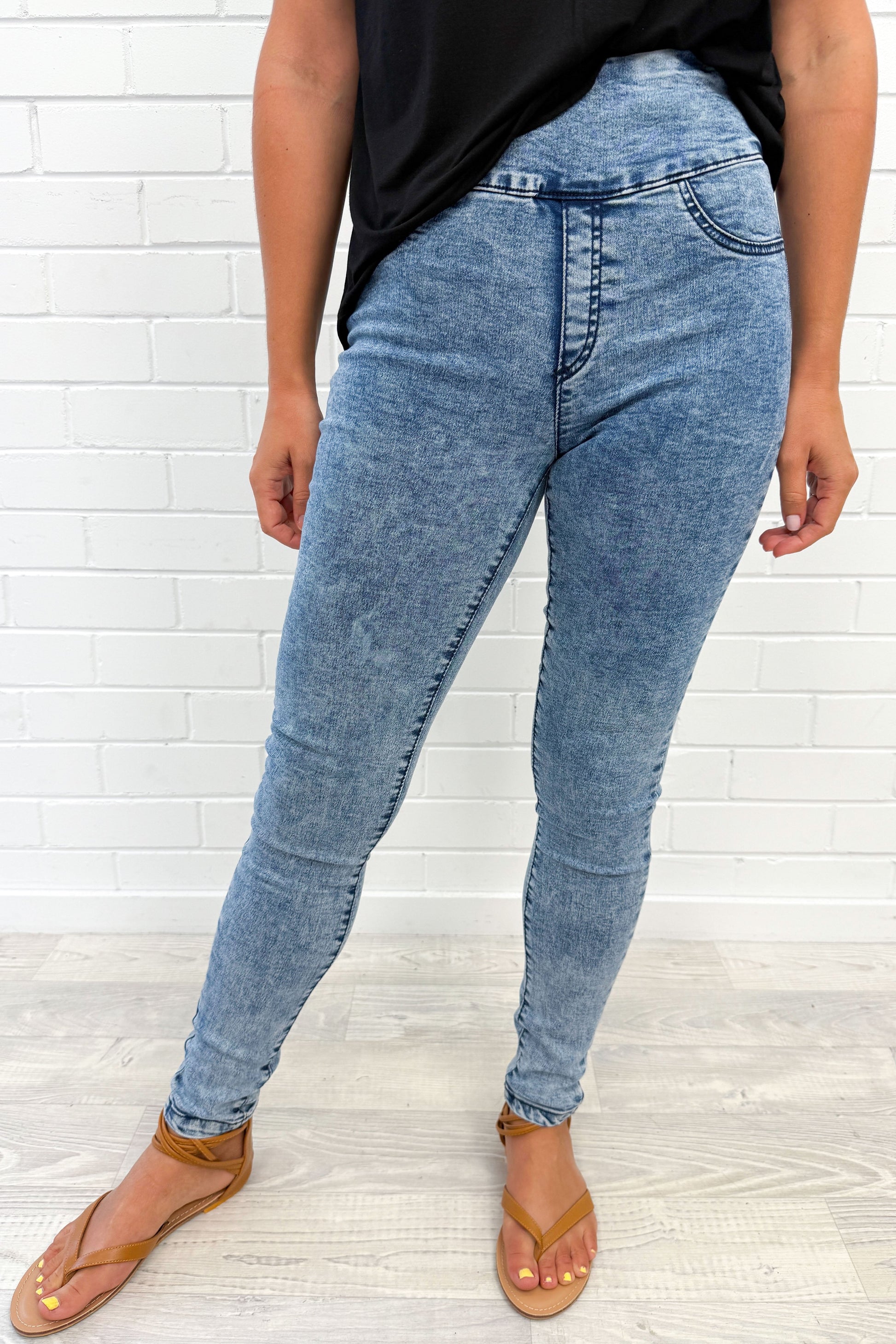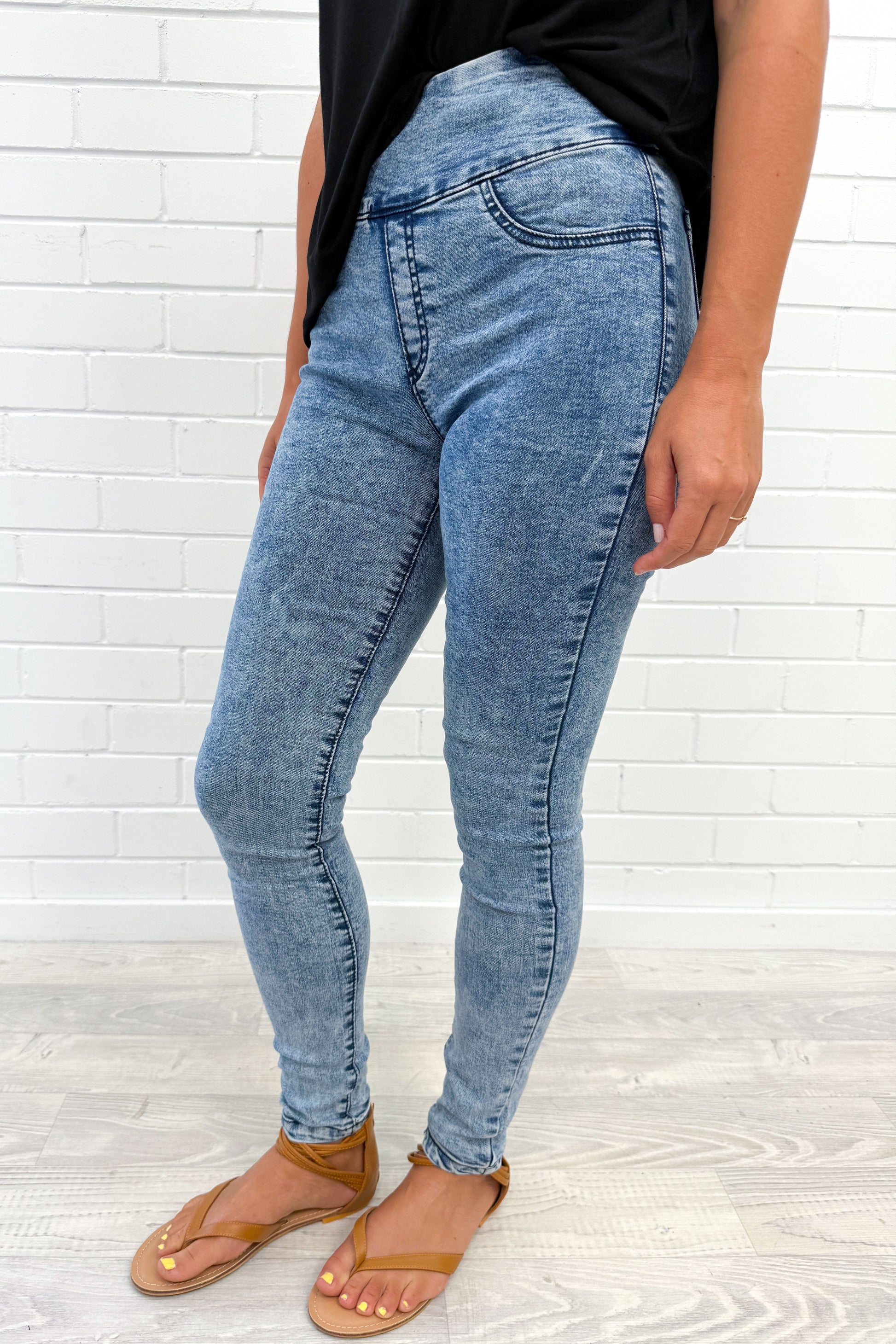 Pretty much the same as our epic Panel Jeans, but without the panel on the knees and a tiny bit thinner. Super stretchy, a good length, and featuring the panel on the tummy - which I know I love. You'll like them.