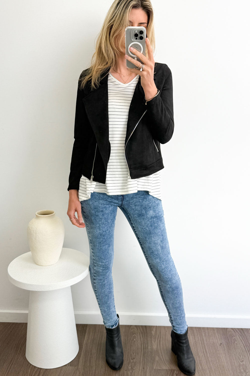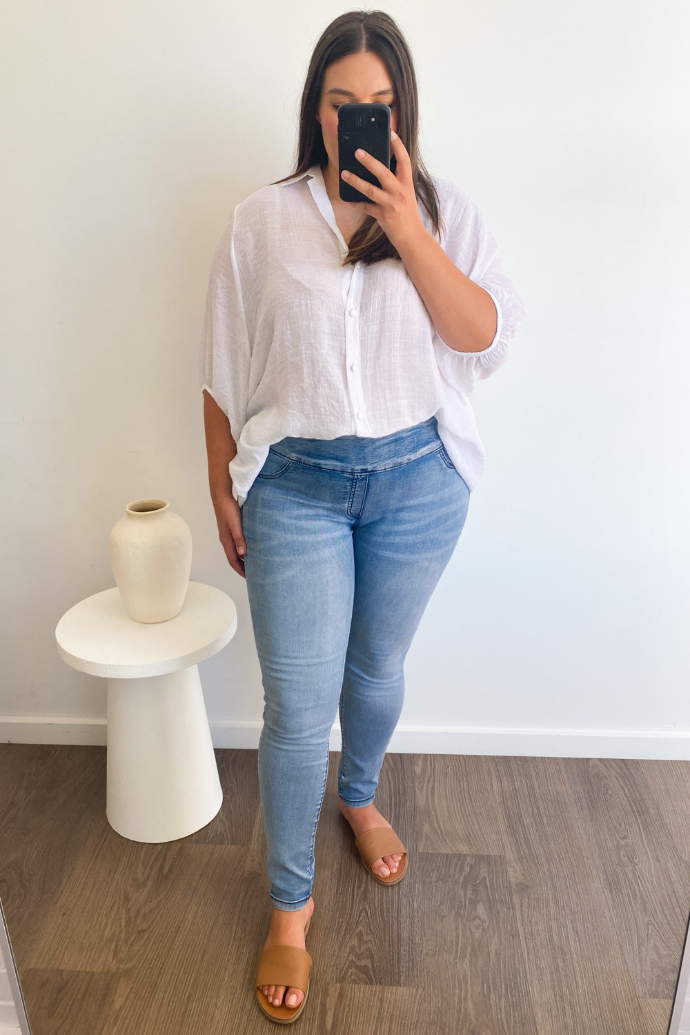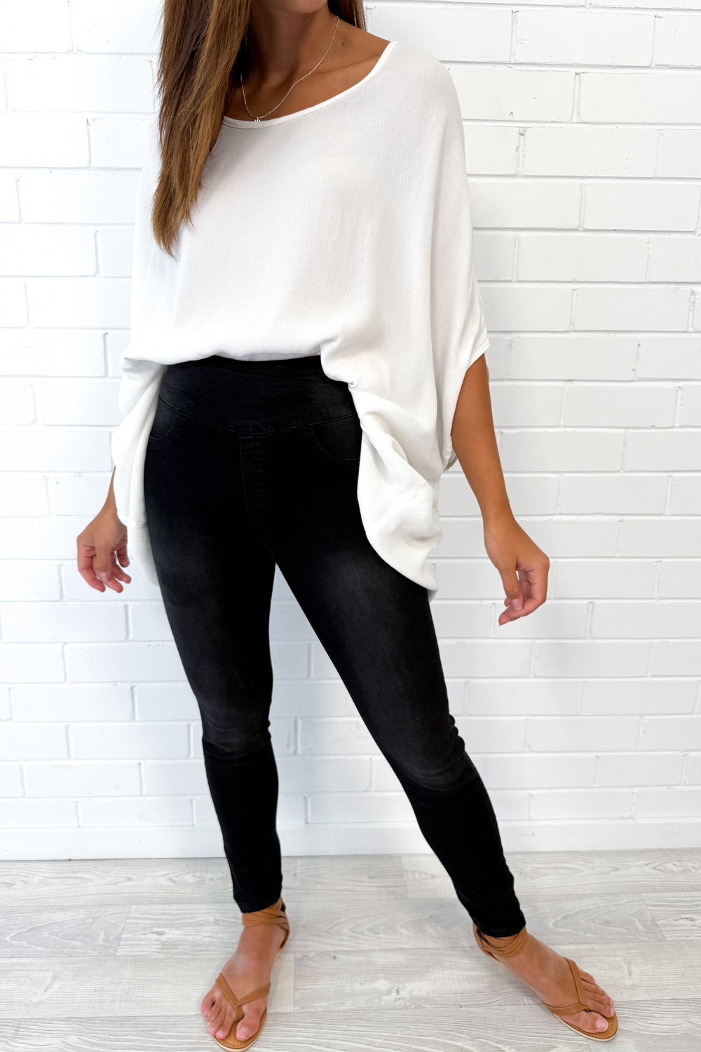 Pretty much the same as our epic Panel Jeans, but without the panel on the knees and a tiny bit thinner. Super stretchy, a good length, and featuring the panel on the tummy - which I know I love. You'll like them.
