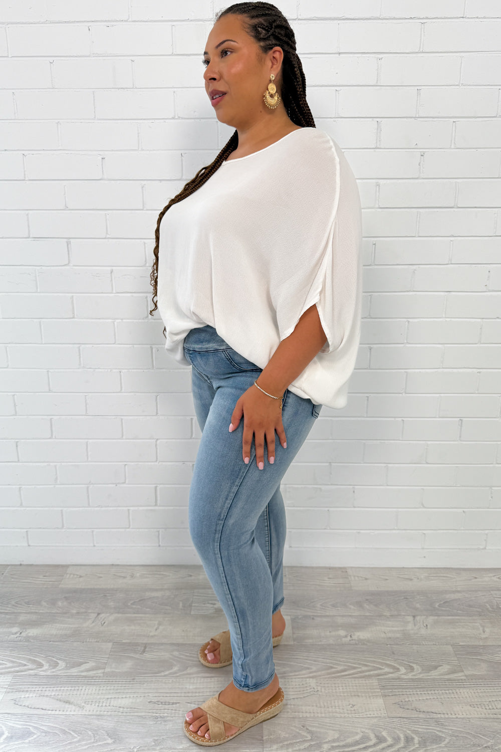 Pretty much the same as our epic Panel Jeans, but without the panel on the knees and a tiny bit thinner. Super stretchy, a good length, and featuring the panel on the tummy - which I know I love. You'll like them.